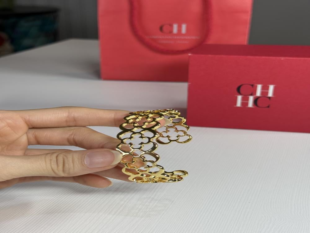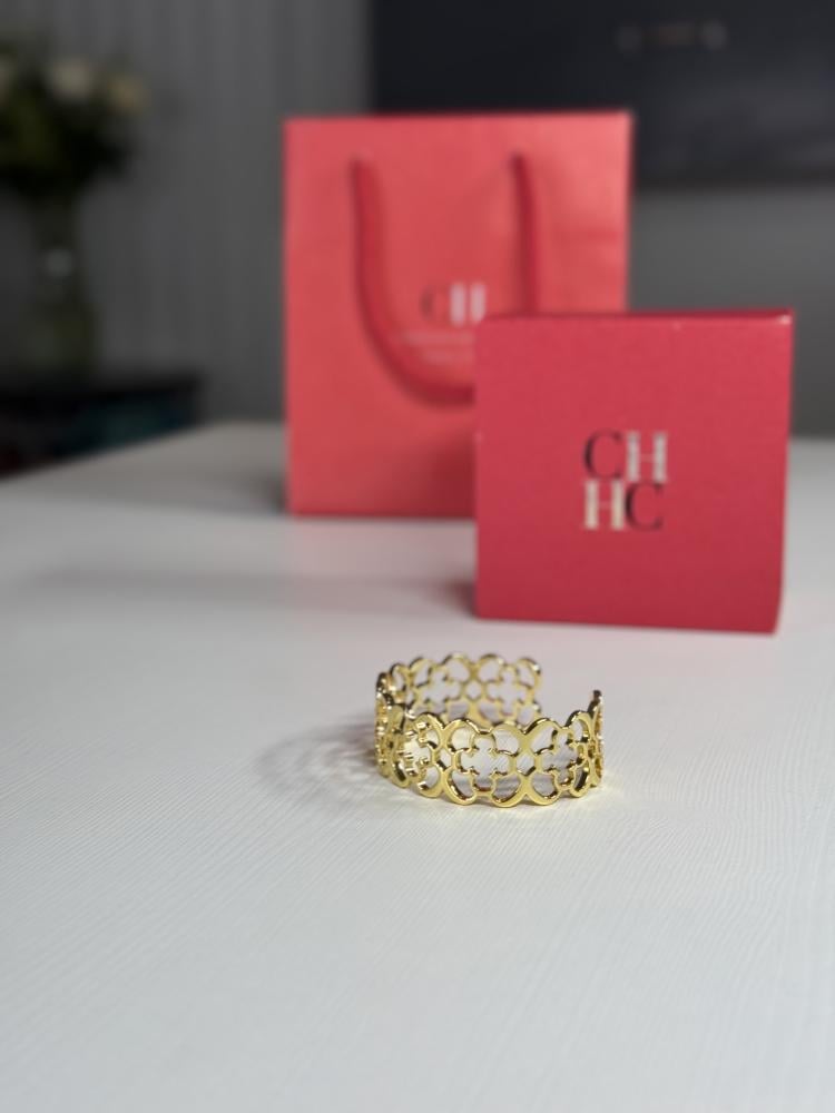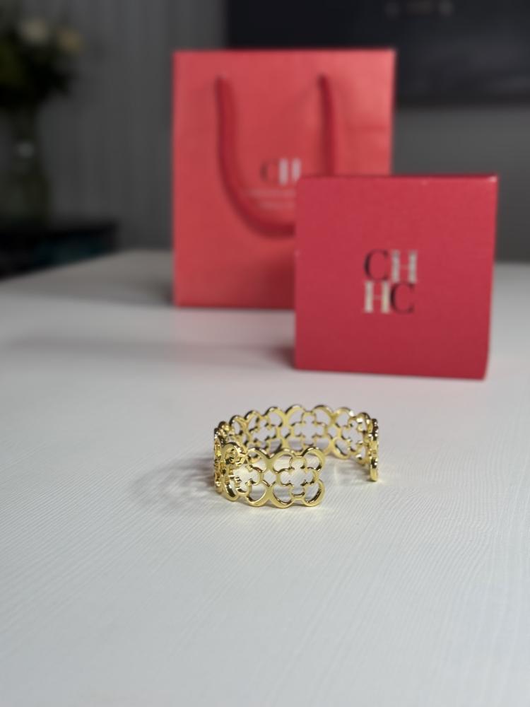 • سوار عريض مطلي بالذهب، مزين بشعار كارولينا على شكل زهرة.