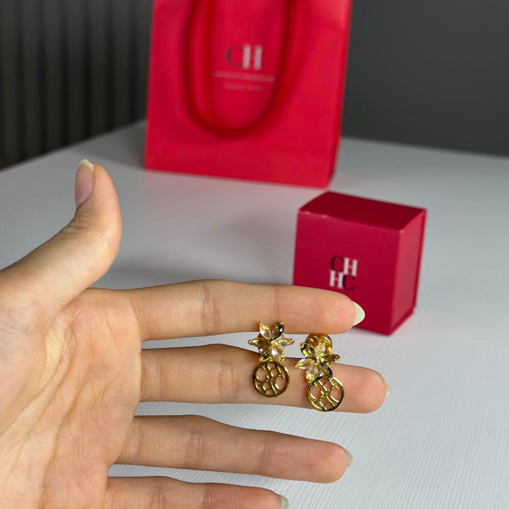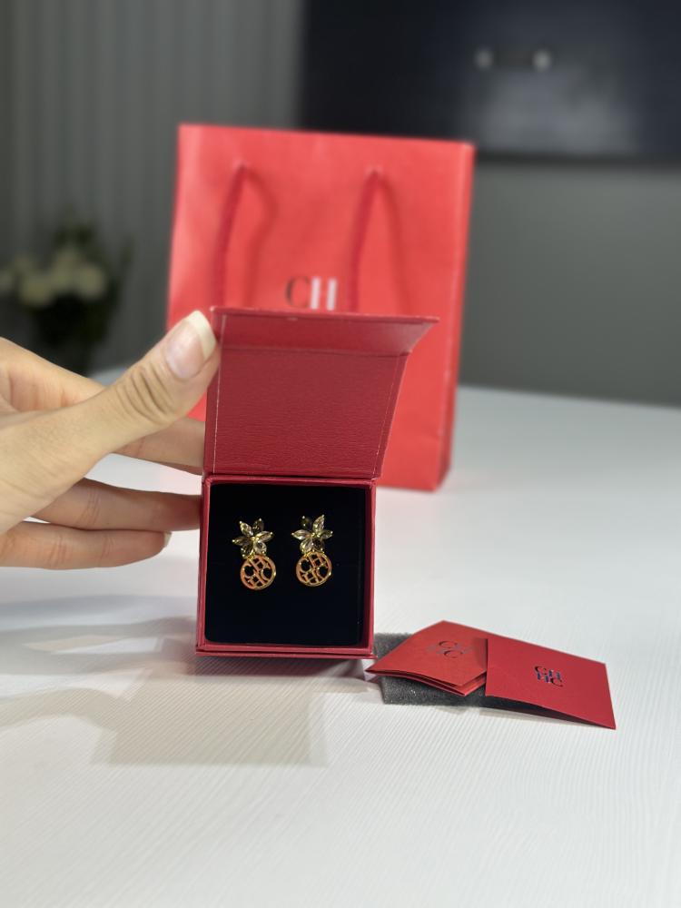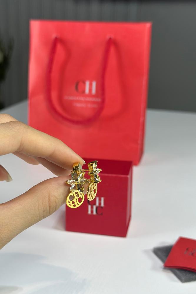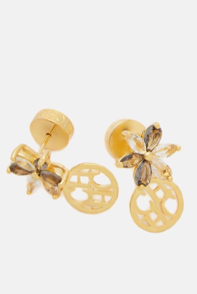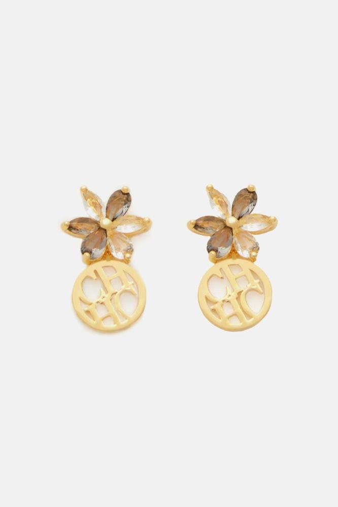 أقراط مطلية بالذهب تتميز بزهور الياسمين المزينة بالكريستال والمعلقة بميداليات تحمل الأحرف الأولى من اسم كارولينا.